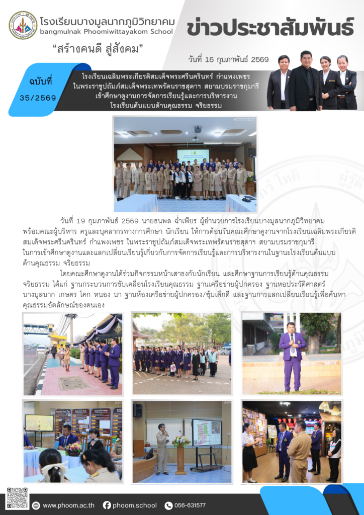 โรงเรียนเฉลิมพระเกียรติสมเด็จพระศรีนครินทร์ กำแพงเพชร ในพระราชูปถัมภ์สมเด็จพระเทพรัตนราชสุดาฯ สยามบรมราชกุมารี เข้าศึกษาดูงานการจัดการเรียนรู้และการบริหารงานโรงเรียนต้นแบบด้านคุณธรรม จริยธรรมBy โรงเรียนบางมูลนากภูมิวิทยาคม / 06/03/2026