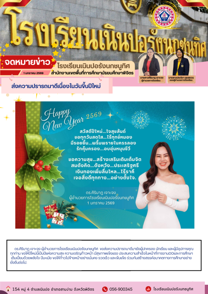โรงเรียนเนินปอรังนกชนูทิศ ดร.ศิรินาฏ เจาะจง ผู้อำนวยการโรงเรียน ส่งความปราถนาดีเนื่องในวันขึ้นปีใหม่By ประชาสัมพันธ์ โรงเรียนเนินปอรังนกชนูทิศ / 12/01/2026