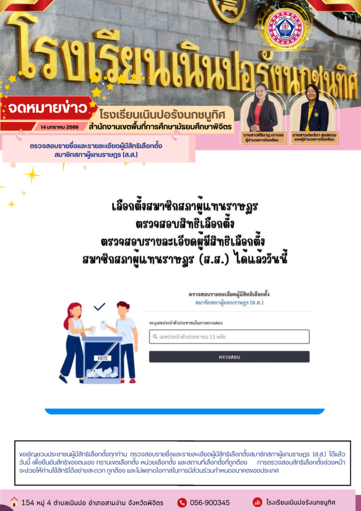 โรงเรียนเนินปอรังนกชนูทิศ ขอเชิญชวนประชาชนผู้มีสิทธิเลือกตั้งทุกท่าน ตรวจสอบรายชื่อและรายละเอียดผู้มีสิทธิเลือกตั้งสมาชิกสภาผู้แทนราษฎร (ส.ส.) ได้แล้ววันนี้By ประชาสัมพันธ์ โรงเรียนเนินปอรังนกชนูทิศ / 03/02/2026