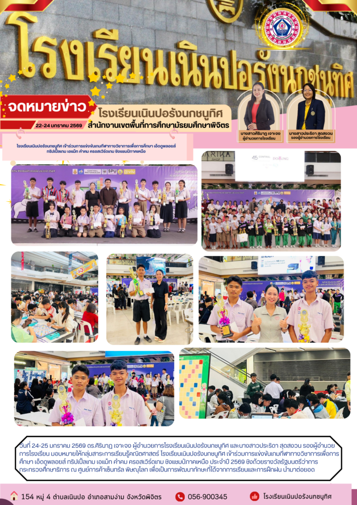 โรงเรียนเนินปอรังนกชนูทิศ เข้าร่วมการแข่งขันเกมกีฬาทางวิชาการเพื่อการศึกษา เอ็ดดูพลอยส์ ทริปเปิ้ลเกม เอแม็ท คำคม ครอสเวิร์ดเกม ชิงแชมป์ภาคเหนือ ประจำปี 2569 ชิงถ้วยรางวัลรัฐมนตรีว่าการกระทรวงศึกษาธิการ ณ ศูนย์การค้าเซ็นทรัล พิษณุโลกBy ประชาสัมพันธ์ โรงเรียนเนินปอรังนกชนูทิศ / 03/02/2026