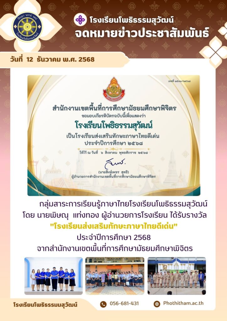 ได้รับรางวัล โรงเรียนส่งเสริมทักษะภาษาไทยดีเด่น ประจำปีการศึกษา 2568 จากสำนักงานเขตพื้นที่การศึกษามัธยมศึกษาพิจิตรBy โรงเรียนโพธิธรรมสุวัฒน์ / 24/12/2025