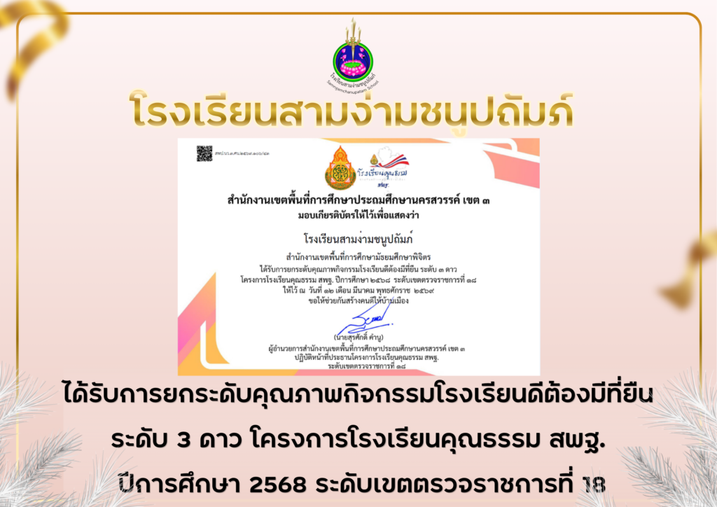 āđ„āļ”āđ‰āļĢāļąāļšāļāļēāļĢāļĒāļāļĢāļ°āļ”āļąāļšāļ„āļļāļ“āļ āļēāļžāļāļīāļˆāļāļĢāļĢāļĄāđ‚āļĢāļ‡āđ€āļĢāļĩāļĒāļ™āļ”āļĩāļ•āđ‰āļ­āļ‡āļĄāļĩāļ—āļĩāđˆāļĒāļ·āļ™ āļĢāļ°āļ”āļąāļš 3 āļ”āļēāļ§ āđ‚āļ„āļĢāļ‡āļāļēāļĢāđ‚āļĢāļ‡āđ€āļĢāļĩāļĒāļ™āļ„āļļāļ“āļ˜āļĢāļĢāļĄ āļŠāļžāļ. āļ›āļĩāļāļēāļĢāļĻāļķāļāļĐāļē 2568 āļĢāļ°āļ”āļąāļšāđ€āļ‚āļ•āļ•āļĢāļ§āļˆāļĢāļēāļŠāļāļēāļĢāļ—āļĩāđˆ 18