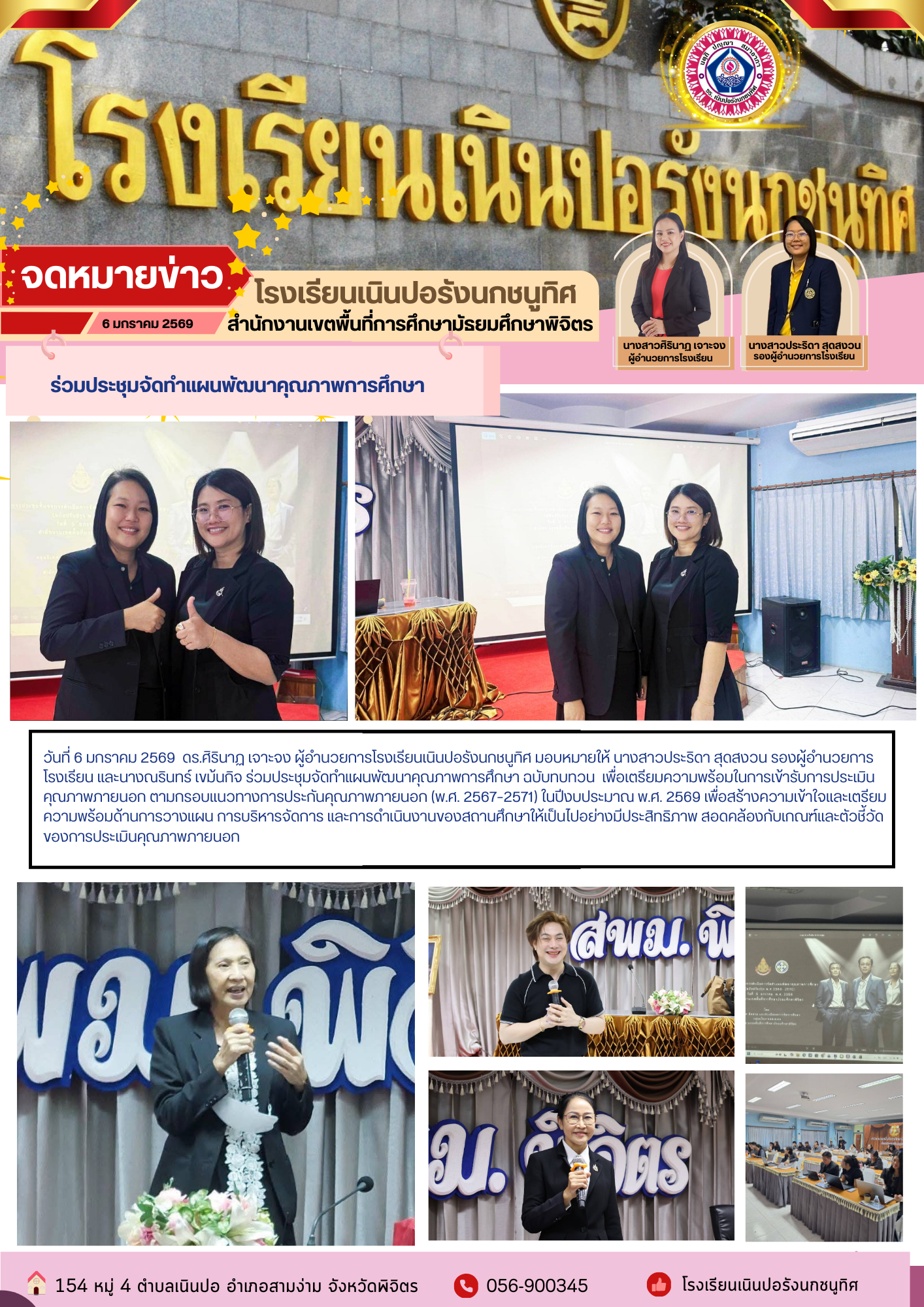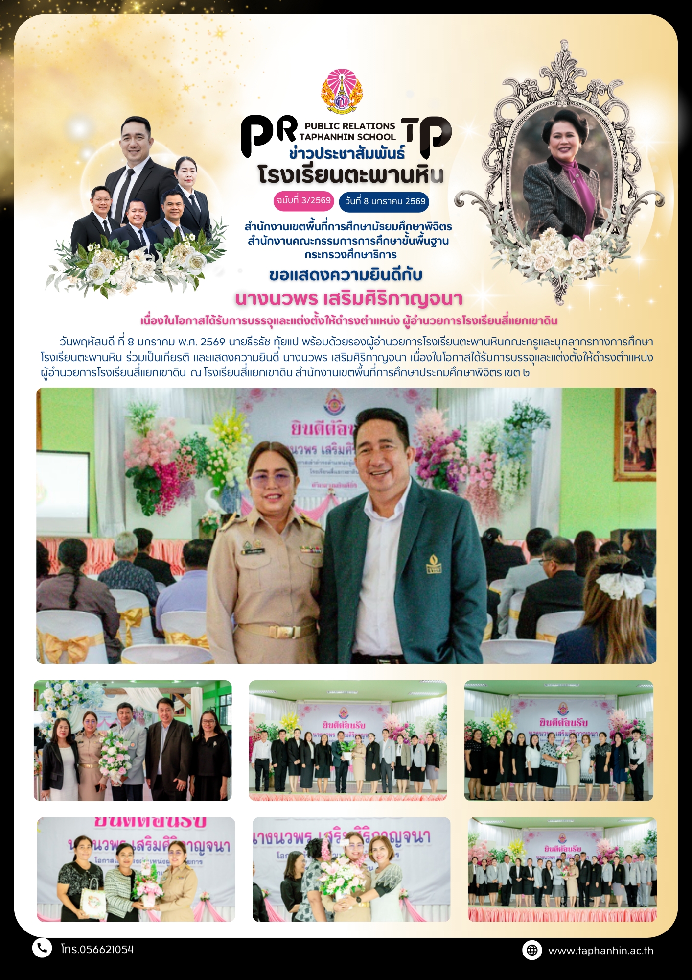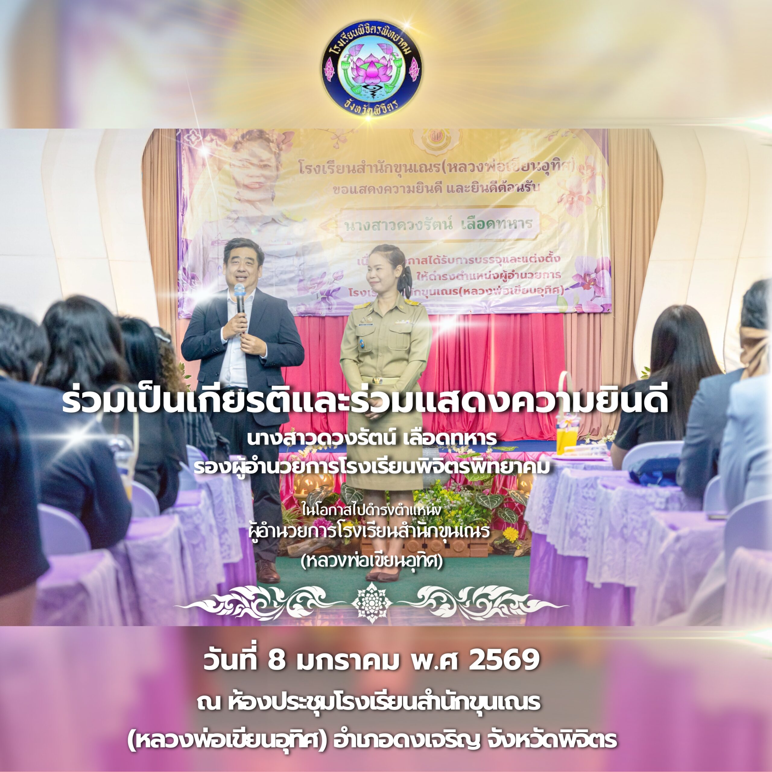 ร่วมเป็นเกียรติและร่วมแสดงความยินดี นางสาวดวงรัตน์ เลือดทหาร รองผู้อำนวยการโรงเรียนพิจิตรพิทยาคม เนื่องในโอกาสได้รับการแต่งตั้งเข้าดำรงตำแหน่ง ผู้อำนวยการโรงเรียนสำนักขุนเณร (หลวงพ่อเขียนอุทิศ)
