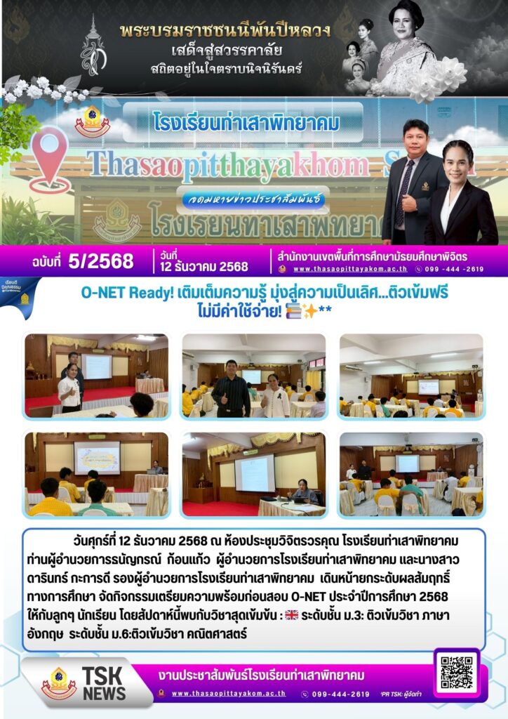 ท่านผู้อำนวยการธนัญกรณ์ ก้อนแก้ว ผู้อำนวยการโรงเรียนท่าเสาพิทยาคม และนางสาวดารินทร์ กะการดี รองผู้อำนวยการโรงเรียนท่าเสาพิทยาคม เดินหน้ายกระดับผลสัมฤทธิ์ทางการศึกษา จัดกิจกรรมเตรียมความพร้อมก่อนสอบ O-NET ประจำปีการศึกษา 2568 ให้กับลูกๆ นักเรียน โดยสัปดาห์นี้พบกับวิชาสุดเข้มข้น: