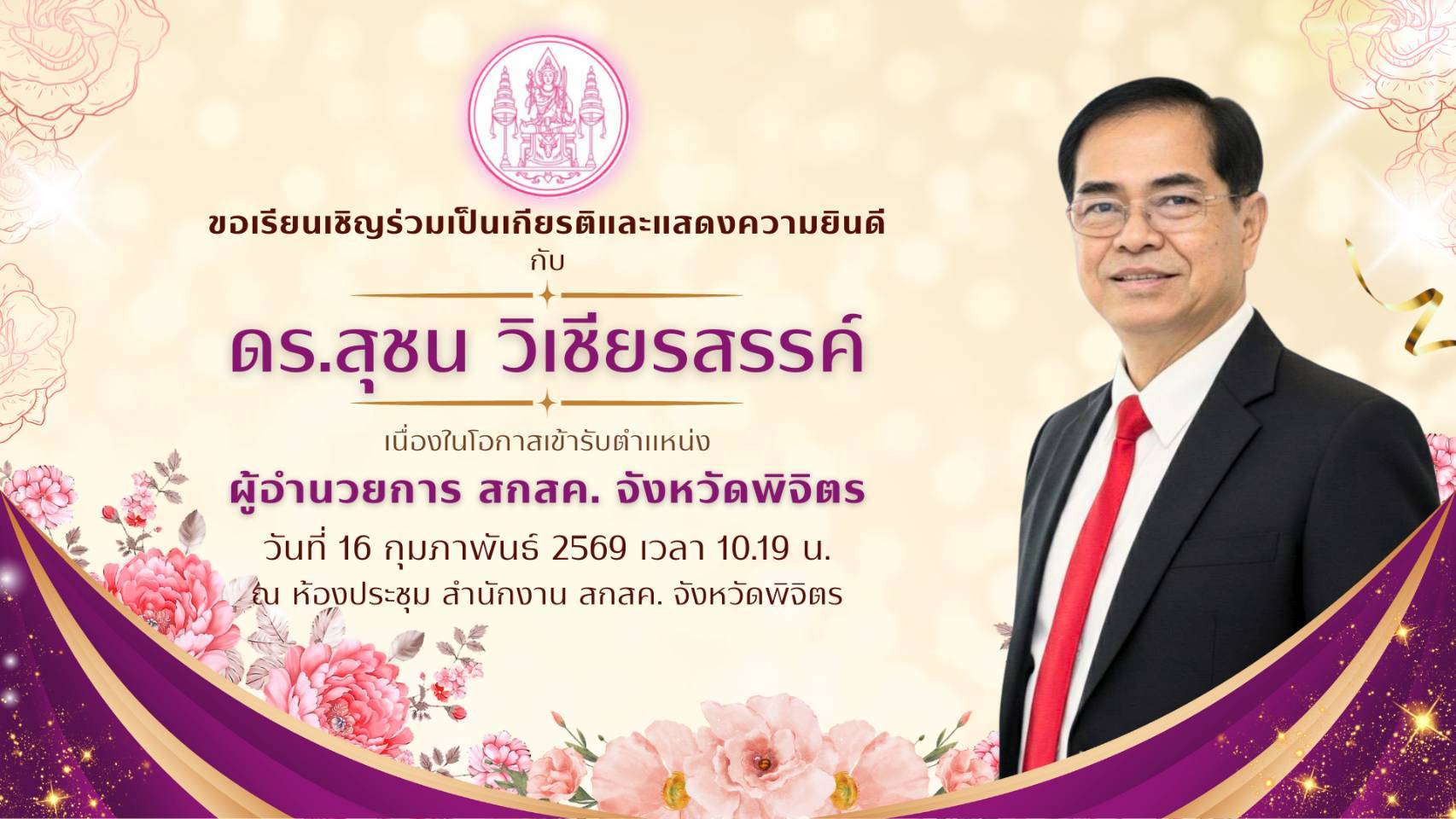 ในนาม สำนักงานเขตพื้นที่การศึกษามัธยมศึกษาพิจิตรขอแสดงความยินดี กับดร.สุชน วิเชียรสรรค์ประธานอ.ก.ค.ศ.สพม.พิจิตรในโอกาสได้รับแต่งตั้งให้ดำรงตำแหน่ง ผู้อำนวยการสำนักงาน สกสค. จังหวัดพิจิตรขอแสดงความยินดีด้วยอย่างยิ่งครับ