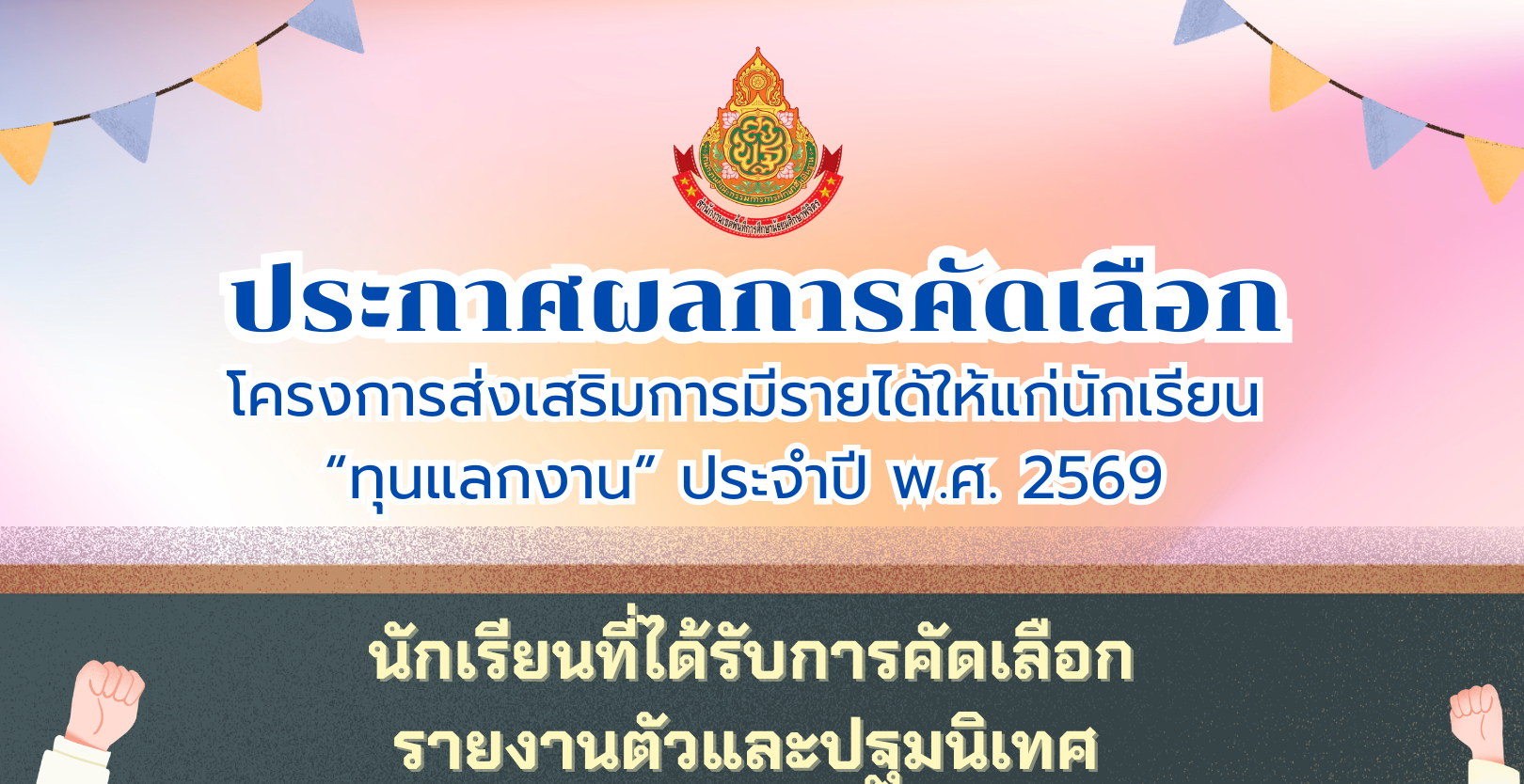ประกาศผลการคัดเลือกนักเรียนเข้าร่วมโครงการส่งเสริมการมีรายได้ให้แก่นักเรียน (ทุนแลกงาน) ประจำปี พ.ศ.2569